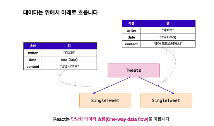 이 원칙은 매우 중요합니다. 얼마나 중요하냐면, 단방향 데이터 흐름(one-way data flow)이라는 키워드가 React를 대표하는 설명 중 하나일 정도입니다.