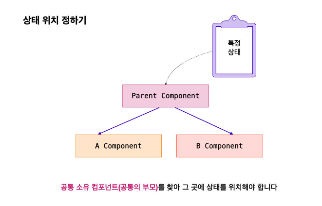 두 개의 자식 컴포넌트가 하나의 상태에 접근하고자 할 때는 두 자식의 공통 부모 컴포넌트에 상태를 위치해야 합니다.