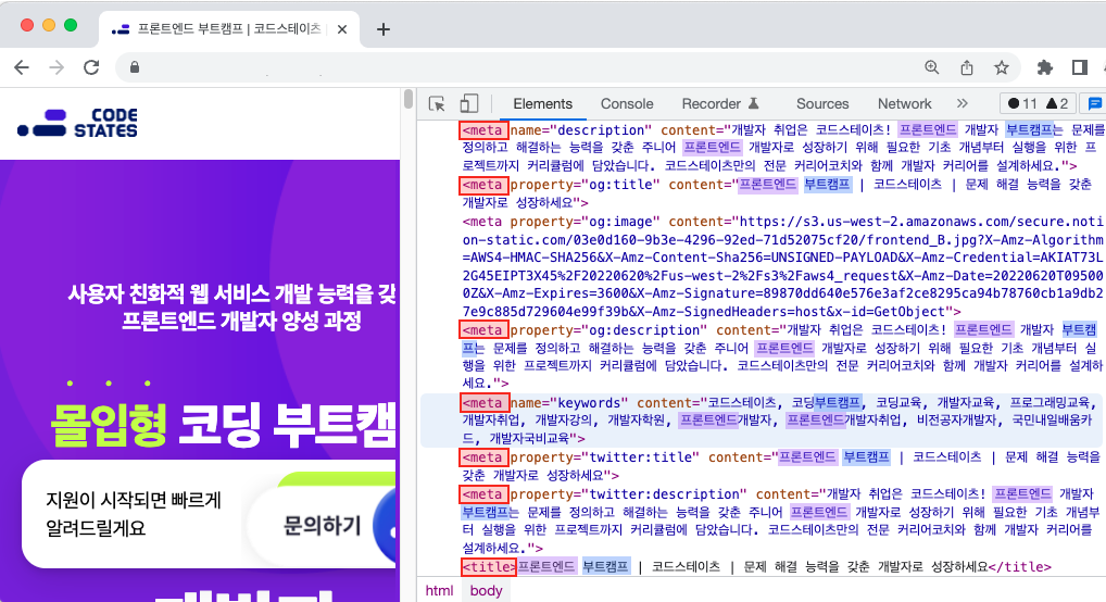 여러 개의 <meta>요소와 <title>요소에 검색 키워드인 ‘프론트엔드’와 ‘부트캠프’가 들어가 있는 것을 확인할 수 있습니다.