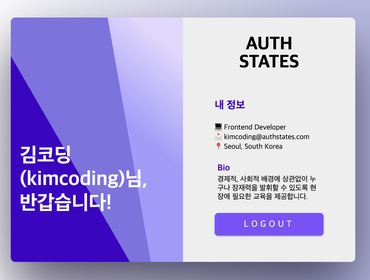 // ๋ก๊ทธ์์์ ์ฑ๊ณตํ๋ค๋ฉด App์ ์ํ๋ฅผ ๋ณ๊ฒฝํ์ธ์.
